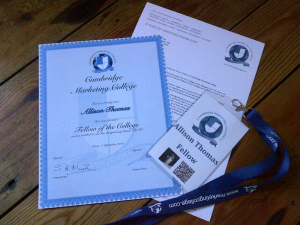 Well, that’s how my week began last week; with the receipt of a surprise package through the post inviting me to become a Fellow of the Cambridge Marketing College.