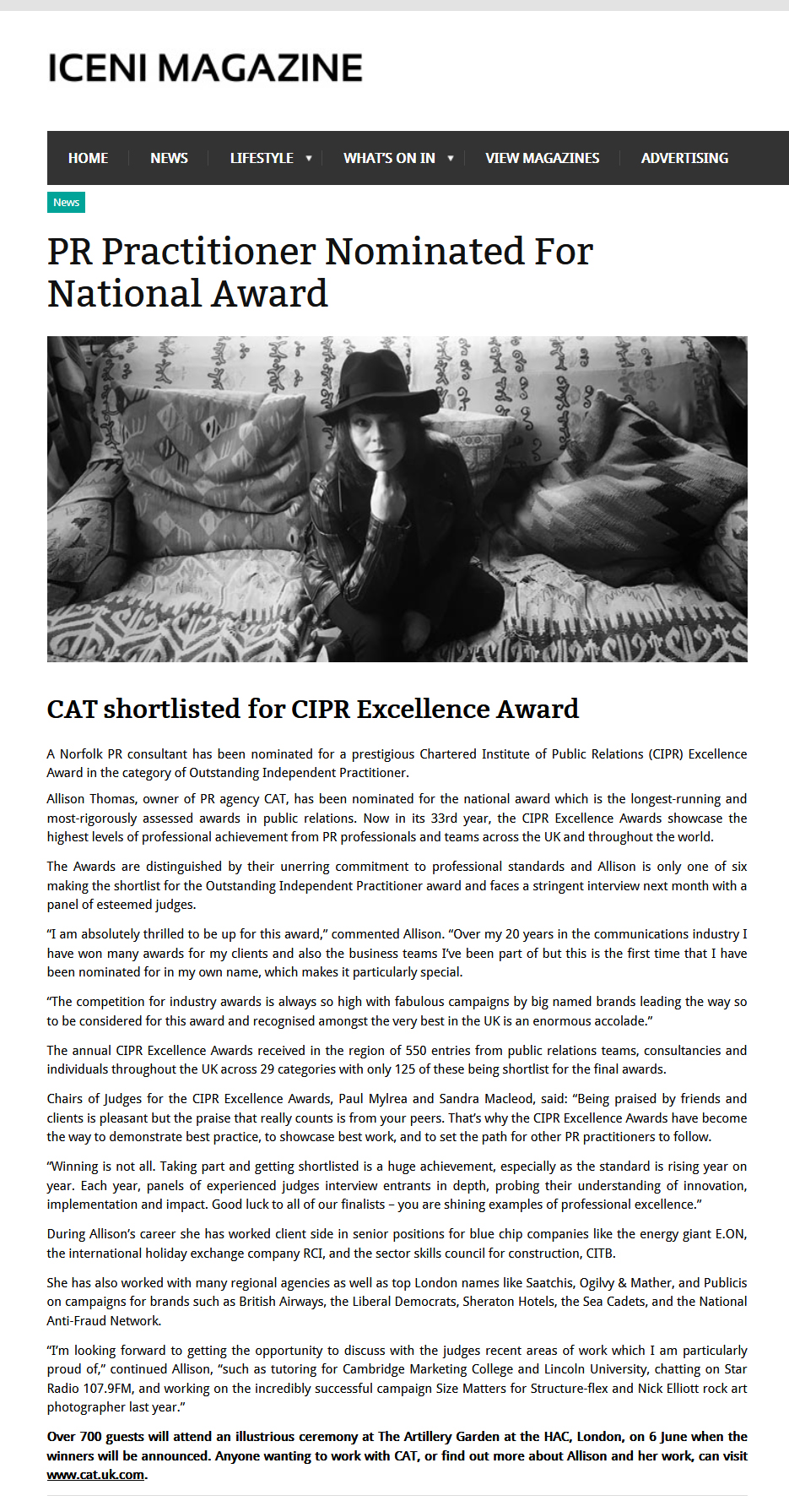 I’m more used to creating news for my clients than making the news myself, but there was a lovely story about my CIPR award nomination in Iceni Magazine this month that I thought would be nice to share.