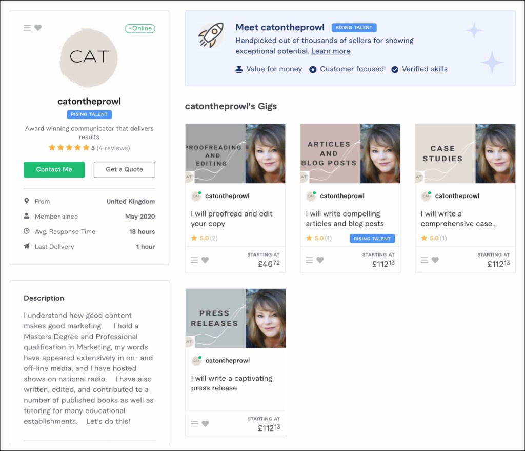 So, if you’re currently looking for someone to do some copywriting for you, check out my Fiverr profile and book me from there: www.fiverr.com/catontheprowl